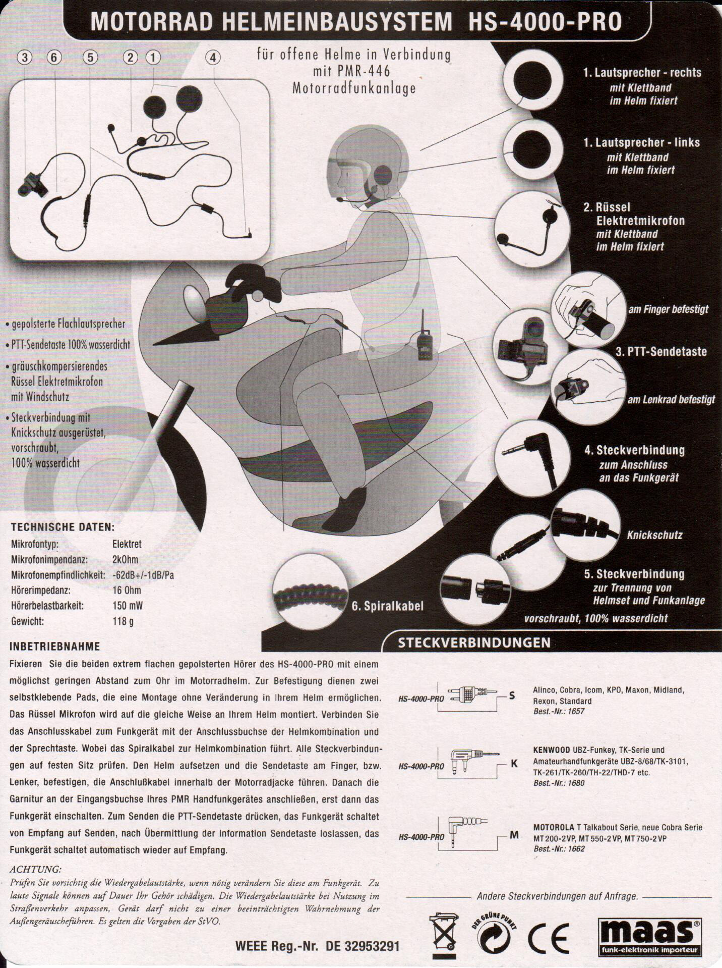 The K-PO HS 4000 PRO S is a built-in speaker microphone set for a open or system full face motorcycle helmet. These headsets are easy to install with velcor strips in your helmet and is equipped with a straight S connector .